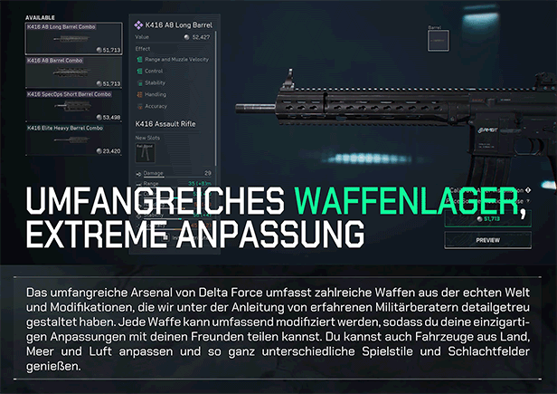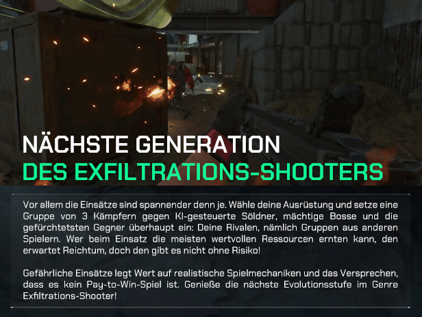 - Einsätze: Delta Force trifft auf die nächste Generation von Exfiltrations-Shootern, wenn du mit deiner Gruppe hinter die feindlichen Linien vorrückst, nach Wertgegenständen suchst, gegen feindliche Spieler kämpfst und exfiltrierst, bevor es zu spät ist. Alternativ bietet unser PvE-Überfall-Modus herausfordernde, zielbasierte Missionen, die deine Gruppe an ihre Grenzen bringen.