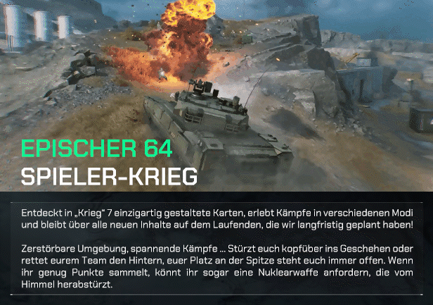 - Krieg: Bekämpfe den Feind zu Land, zu Wasser und in der Luft in wahrhaft epischen 32-vs-32-PvP-Kämpfen mit einer großen Auswahl an Fahrzeugen und einzigartiger taktischer Ausrüstung.